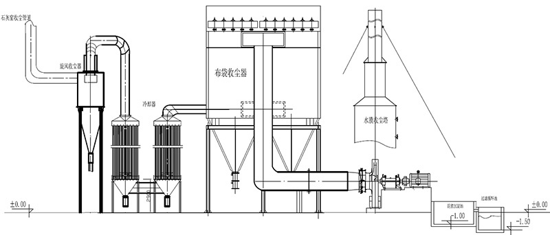 項目廢氣——→旋風(fēng)除塵器——→列管散熱器——→布袋收塵器——→引風(fēng)機——→脫硫塔——→干凈氣體排出