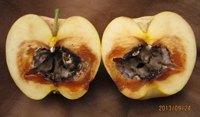 只危害果實(shí)。分為霉心型和心腐型。初期心室組織變褐壞死,后向外擴(kuò)展,果肉變褐色或者深褐色,味苦,可從果柄洼出爛透。心室內(nèi)充滿白色、黑褐色、青綠色或者粉紅色霉層,以粉紅色霉層最常見。幼果發(fā)病,內(nèi)外常包敷紅粉。北斗、元帥系品種的病果易脫落,青香蕉的病幼果多在樹上變黃,國(guó)光則干縮成黑色小僵果,掛在樹上經(jīng)冬不落。