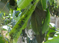 癥狀: 芒果蚜蟲以成蟲、若蟲均集中于嫩梢、嫩葉的背面,花穗及幼果柄上吸取汁液,引起卷葉,枯梢,落花落果,影響新梢伸長,嚴(yán)重時(shí)導(dǎo)致新梢枯死。屬常發(fā)性主要害蟲。同時(shí)還分泌蜜露,誘發(fā)煤煙病。