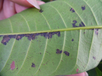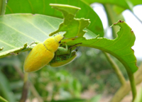 癥狀:該蟲以芒果嫩葉為食料,每年5~11月均有發(fā)生,主要以幼蟲危害嫩葉、葉柄和主脈,被害葉呈褐斑狀,與葉斑病近似,葉背面有小點(diǎn)凸起,后期穿孔破裂,葉片卷曲,嚴(yán)重時(shí)致辭使葉片枯萎脫落甚至梢枯,造成植株生長衰弱。