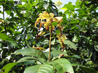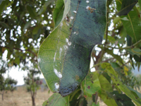癥狀:介殼蟲為害葉片、枝條和果實(shí)。幼蟲和雌成蟲群集在芒果葉背或果實(shí)的表面,用口器插入組織內(nèi)吸取汁液,被害部分產(chǎn)生黃色的斑點(diǎn),嚴(yán)重影響果皮的質(zhì)量。其排泄物能引起煤污病。