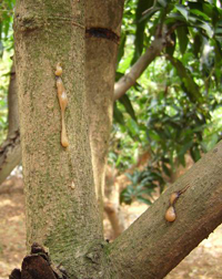 發(fā)病規(guī)律:病原為半知菌亞門擬莖點(diǎn)(Phomopsis mangiferae)和色二孢霉(Diplodia mangiferae)病菌均以菌絲體和子實(shí)體(分孢器)在病株和病殘?bào)w上存活。氣溫適宜時(shí),分孢器涌出大量分生孢子,借風(fēng)雨傳播,主要從傷口侵入致病。溫暖多濕有利于病菌繁殖傳播侵染,植株、果實(shí)病、蟲傷口多樹勢哀落的果實(shí)發(fā)病較重。